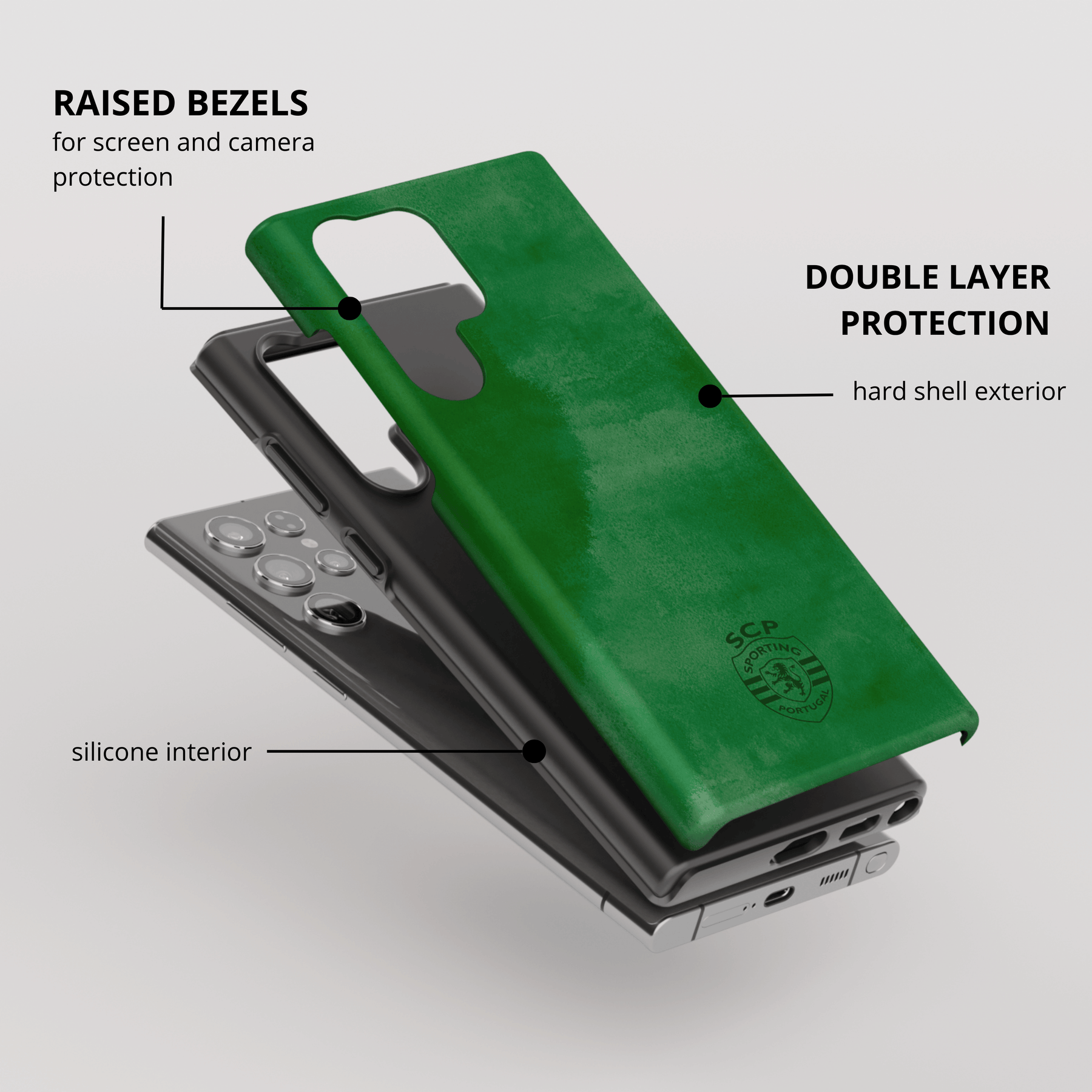 • Doble capa: interior de silicona + exterior de TPU duro